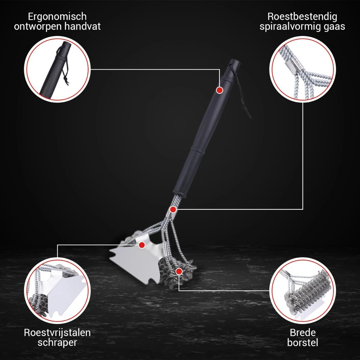 Het borsteltje gaat lang mee door het stevige ontwerp met spiraalvormig gaas. Door de ergonomische grip ligt de barbecueborstel fijn in de hand. Met de roestvrijstalen schraper kun je alle resten vuil en vet makkelijk en snel van de BBQ verwijderen. De lange steel voorkomt dat je je handen verbrandt.