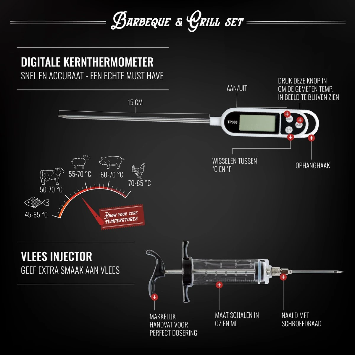 Mountain Jack® 40-Delige Luxe BBQ Grill Accessoires Set In Roestvrij Staal – Barbecue Gereedschap – Tangenset, Vlees Thermometer, Vleestang, Borstel, Spiezen, Vleesmes, Vleesvork